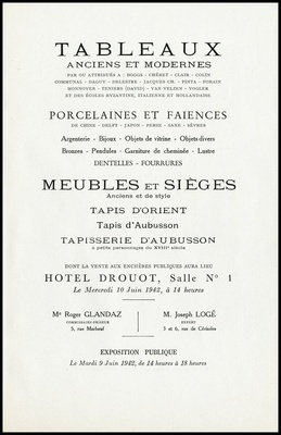 Tableaux : anciens et modernes : par ou attribués à: Boggs, Chéret, Clair, Colin [und weiteren] : porcelaines et faïences de Chine, Delft, Japon, Perse, Saxe, Sèvres : argenterie, bijoux, objets de vitrine, objets divers, bronzes, pendules, garniture de cheminée, lustre : dentelles, fourrures : meubles et sièges anciens et de style : tapis d'Orient, tapis d'Aubusson : tapisserie d'Aubusson à petits personnages du XVIIIe siècle : dont la vente aux enchères publiques aura lieu Hôtel Drouot, Salle No 1, le mercredi 10 juin 1942 / Roger Glandaz, commissaire-priseur ; Joseph Logé, expert