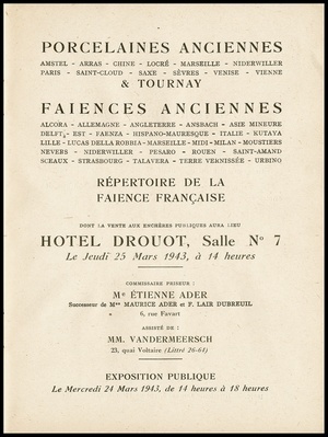 Porcelaines anciennes : Amstel, Arras, Chine, Locré, Marseille, Niderwiller, Paris, Saint-Cloud, Saxe, Sèvres, Venise, Vienne & Tournay : faïences anciennes : Alcora, Allemagne, Angleterre, Ansbach, Asie Mineure, Delft, Est, Faenza, Hispano-Mauresque, Italie, Kutaya, Lille, Lucas della Robbia, Marseille, Midi, Milan, Moustiers, Nevers, Niderwiller, Pesaro, Rouen, Saint-Amand, Sceaux, Strasbourg, Talavera, Terre Vernissée, Urbino : répertoire de la faïence française : dont la vente aux enchères publiques aura lieu Hôtel Drouot, Salle No 7 le jeudi 25 mars 1943 / commissaire-priseur: Étienne Ader, successeur de Maurice Ader et F. Lair Dubreuil ; assisté de: MM. Vandermeersch