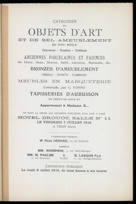 Catalogue des objets d'art : et de bel ameublement du XVIIIe siècle : gravures, dessins, tableau : ancienne porcelaines et faïences de Chine, Saxe, Sèvres, Delft, Lorraine, Marseille, etc. : bronzes d'ameublement : pendule, chenets, flambeaux : meubles en Marqueterie : commode par C. Topino : tapisseries d'Aubusson du temps de Louis XV : appartenant à Madame X... : et dont la vente aux enchères publiques aura lieu à Paris, Hôtel Drouot, Salle No 11, le vendredi 7 juillet 1916 / commissaire-priseur René Hémard ; experts M. Mannheim, M. Paulme & B. Lasquin Fils