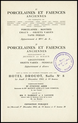 Porcelaines et faïences anciennes : 1. Porcelaines et faïences anciennes : des fabriques de Allemagne, Amstel, Angleterre, Chine, Delft, Est, Faenza, Hochst, Hollitch, Indes, Italie, Japon, Louisbourg, Nevers, Niederviller, Paris, Pesaro, Rouen, Saxe, Sèvres, Strasbourg, Tournai, Venise, Vienne, Vincennes, etc. : porcelaines, montres, émaux, objets variés, tapis persan : appartenant à Mmes de X... : 2. Porcelaines et faïences anciennes : principalement de Mennecy et Sceaux : argenterie, objets variés, pendule : appartent à divers : dont la vente aux enchères publiques aura lieu Hôtel Drouot, Salle No 8 le jeudi 2 décembre 1943 / commissaire-priseur: Étienne Ader, successeur de Maurice Ader et F. Lair Dubreuil ; assisté de: P. Damidot et J. Lacoste, expert près le Tribunal civil de la Seine