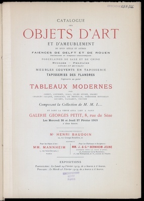 Catalogue des objets d'art et d'ameublement : du XVIIIe siècle et autres : faïences de Delft et de Rouen : italiennes et hispano-mauresques : porcelaines de Saxe et de Chine : bronzes, pendules : sièges et meubles : meubles couverts en tapisserie : tapisseries des Flandres : tapisserie au point : tableaux modernes : par Corot, Courbet, Diaz, Jules Dupré, Isabey [und weiteren] : composant la Collection de M. M. L... : dont la vente aura lieu à Paris, Galerie Georges Petit, 8, rue de Sèze, les mercredi 26 et jeudi 27 février 1919 / commissaire-priseur Henri Baudoin ; experts pour les objets d'art: M.M. Mannheim, pour les tableaux et sculptures: J. & G. Bernheim-Jeune, experts près la Cour d'Appel