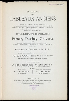Catalogue des tableaux anciens : par Boucher (Fr.), Corneille de Lyon, David (L.-L.) [und weiteren] : œuvres importantes de Largillièrre : pastels, dessins, gravures : par Blœmaert (A.), Carriera (Rosalba), Ducreux (J.), Huet (J.-B.) [und weiteren] : composant la Collection de M. G. S.... : dont la vente aux enchères publiques aura lieu à Paris, Hôtel Drouot, Salles Nos 9 et 10 réunies, le vendredi 22 mai 1925 / commissaires-priseurs André Desvouges, Henri Baudoin ; experts pour les tableaux F. Marboutin, pour les pastels, dessins et gravures: Loys Delteil