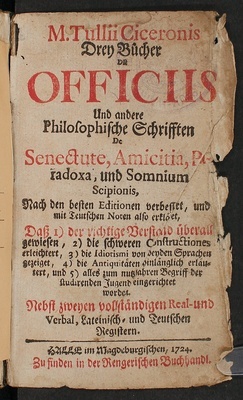 M. Tullii Ciceronis Drey Bücher De Officiis und andere Philosophische Schrifften : De senectute, Amicitia, Paradoxa, und Somnium Scipionis, Nach den besten Editionen verbessert, und mit Teutschen Noten also erkläret, Daß 1) der richtige Verstand überall gewiesen, 2) die schweren Constructiones erleichtert, 3) die Idiotismi von beyden Sprachen gezeiget, 4) die Antiquitäten hinlänglich erläutert, und 5) alles zum nutzbahren Begriff der studirenden Jugend eingerichtet worden ; Nebst zweyen vollständigen Real- und Verbal, Lateinisch und Teutschen Registern