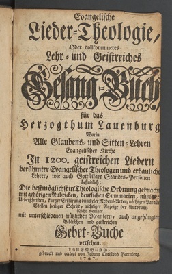 Evangelische Lieder-Theologie : Oder vollkommneres Lehr- und Geistreiches Gesang-Buch, für das Herzogthum Lauenburg, Worin Alle Glaubens- und Sitten-Lehren Evangelischer Kirche In 1200. geistreichen Liedern berühmter Evangelischer Theologen und erbaulicher Lehrer, wie auch Gottseliger Standes-Personen befindlich: Die bestmöglichst in Theologische Ordnung gebracht, mit gehörigen Rubricken, deutlichen Summarien, nützlichen Ueberschriften, kurzer Erklärung dunckeler Redens-Arten, nöthigen Parallel-Stellen heiliger Schrift, richtiger Anzeige der Autorum, Nicht weniger mit unterschiedenen nützlichen Registern, auch angehängtem Biblischen und geistreichen Gebet-Buche versehen
