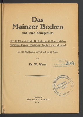 Das Mainzer Becken und seine Randgebiete : eine Einführung in die Geologie des Gebietes zwischen Hunsrück, Taunus, Vogelsberg, Spessart und Odenwald / von W. Wenz