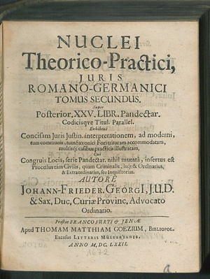 Nucleus Theorico-Practicus Juris Romano-Germanici, Privati, publicique : Qui Secundum Pandectarum, Codicisque Seriem exhibet concisam Iuris Iustinianei interpretationem, Eiusdemque Ad moderni, tum communis, tum Saxonici fori trituram, seu Processum accommodationem / Autore Johann-Friderico Georgi ...