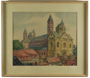 Ohne Titel (Mainz, Dom vom Rhein aus gesehen, Schiffe im Vordergrund)
