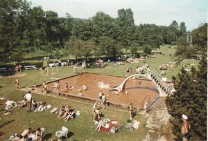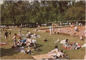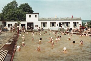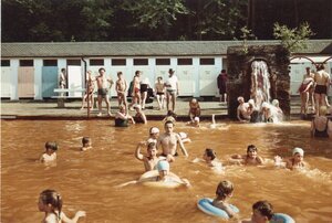 Druckvorlage für Ansichtskarte "Kinder tummeln sich im braunen Beckenwasser des Thermalfreibades Bodendorf.