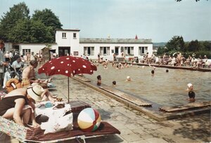 Druckvorlage für Ansichtskarte "Blick über das Schwimmbad zum Eingangsbereich und Schwimmbadcafé"