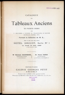 Catalogue des tableaux anciens de premier ordre : par F. Boucher, A. Durer, H. Fragonard, Le Moyne, Murillo, Pater, etc. : formant la collection de M. S... : dont la vente aura lieu à Paris, Hôtel Drouot, Salle No 1, le jeudi 14 juin 1900 / Georges Duchesne, commissaire-priseur ; Henri Haro, peintre-expert