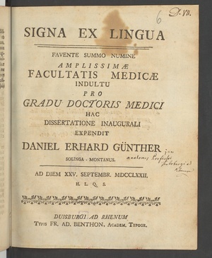 Signa ex lingua / Favente Summo Numine Amplissimæ Facultatis Medicæ Indultu Pro Gradu Doctoris Medici Hac Dissertatione Inaugurali Expendit Daniel Erhard Günther, Solinga-Montanus. Ad Diem XXV. Septembr. MDCCLXXII. H. L. Q. S.