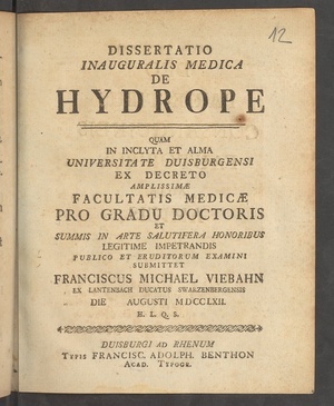 Dissertatio Inauguralis Medica De Hydrope / Quam ... Publico Et Eruditorum Examini Submittet Franciscus Michael Viebahn, Ex Lantenbach Ducatus Swarzenbergensis, Die Augusti MDCCLXII.