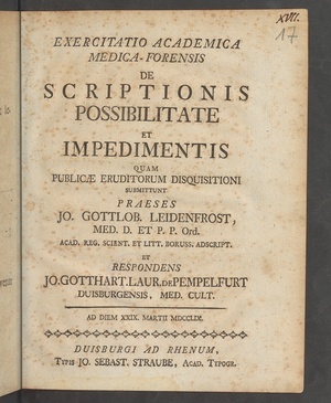 Exercitatio Academica Medica-Forensis De Scriptionis Possibilitate Et Impedimentis / Quam Publicæ Eruditorum Disquisitioni Submittunt Praeses Jo. Gottlob Leidenfrost, ... Et Respondens Jo. Gotthart. Laur. de Pempelfurt, Duisburgensis, Me. Cult., Ad Diem XXIX. Martii MDCCLIX.