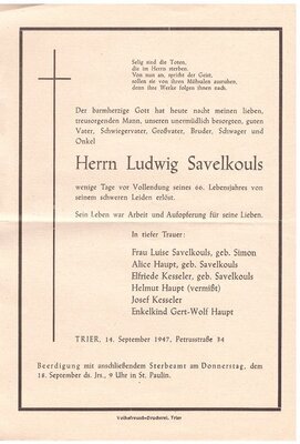 Todesanzeige Ludwig Savelkouls 14.09.1947