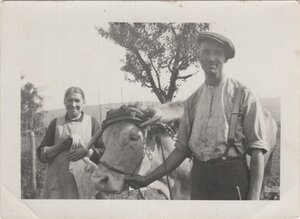 Ehepaar mit Arbeitsochsen bei der Feldarbeit