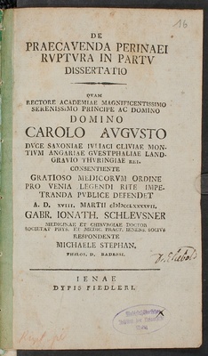 De Praecavenda Perinaei Rvptvra In Partv Dissertatio / Qvam Rectore Academiae Magnificentissimo Serenissimo Prinicipe Ac Domino Domino Carolo Avgvsto Dvce Saxoniae ... Consentiente Gratioso Medicorvm Ordine Pro Venia Legendi Rite Impetranda Pvblice Defendet A. D. XVIII. Martii MDCCLXXXXVII. Gabr. Ionath. Schlevsner Medicinae Et Chirvrgiae Doctor Societat Phys. Et Medic. Pract. Ienens. Socivs Respondente Michaele Stephan Philos. D. Badensi.