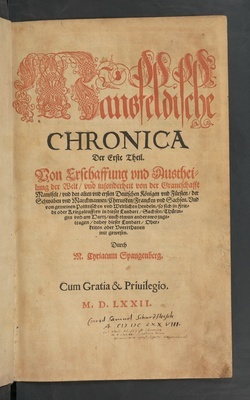 Mansfeldische Chronica : von der Erschaffung und Austheilung der Welt, und insonderheit von der Graueschafft Mansfelt vnd den alten vnd ersten Deutschen Koenigen vnd Fuersten der Schwaben vnd Marckmannen Cherusken Francken vnd Sachsen. Vnd von gemeinen Polittischen vnd Weltlichen hendeln so sich in Friede oder Kriegsleufften in dieser Landart Sachsen Thueringen vnd am Hartz auch etwan anderswo zugetragen dabey dieser Landart Oberkeiten oder Vnterthanen mit gewesen. / Durch M. Cyriacum Spangenberg.