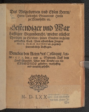 Des Wolgebornen vnd Edlen Herrn, Herrn Volraths, Grauen vnd Herrn zu Mansfeldt etc. : bestendiger und Warhafftiger Gegenbericht, wieder etlicher Theologen zu Eisleben, seinen Gnaden in ihrem gedruckten Buch: Vom offentlichem Zeugnis Matt. Flacii Illyrici etc. zugemessene vnbilliche Aufflagen ; Beneben den Acten Colloquii Anno 1572. den 3. vnd 4. Septemb. Auff dem Hause Mansfelt, Vber dem Artickel von der Erbsünde gehalten, warhafftig und trewlich gefasset / Volrath Graven zu Mansfeldt