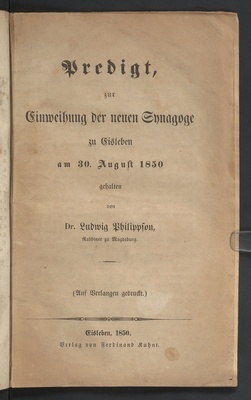 Predigt, zur Einweihung der neuen Synagoge zu Eisleben am 30. August 1850 / gehalten von Dr. Ludwig Philippson, Rabbiner zu Magdeburg