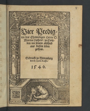 Vier Predigten des Ehrwirdigen Herrn D. Martini Luthers, zu Eisleben vor seinem abschied aus diesem leben gethan. / [Hrsg.: Johannes Aurifaber]