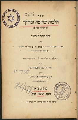 Sefer hilkot sheḥita u-vediḳa : in daitsher sprakhe : nach Sefer More le-Zovḥim fun Yiṣḥaḳ Dov-ha-Leṿi ; heroisgegeben fun Zalman Bamberger in Niederhagental (Elsass)
