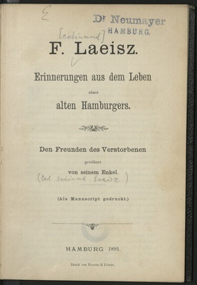 F. Laeisz : Erinnerungen aus dem Leben eines alten Hamburgers ; den Freunden des Verstorbenen gewidmet von seinem Enkel