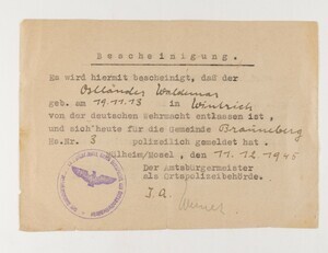 Entlassungsformular der französischen Militärregierung für Wehrmachtangehörige: Waldemar Ostländer