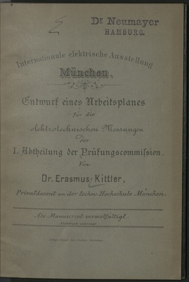 Entwurf eines Arbeitsplanes für die elektrotechnischen Messungen ... / Erasmus Kittler