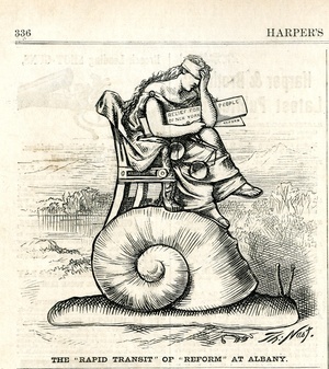 The "rapid transit" of "reform" at Albany : Justitia sitzt mit dem Entwurf einer Reform unter dem Arm auf einer Schnecke / Th. Nast