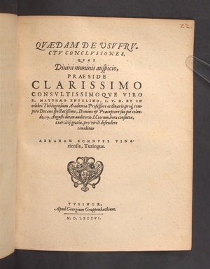 QVAEDAM DE USVFRVCTV CONCLVSIONES, QVAS ... PRAESIDE ... D.MATTHAEO ENTZLINO, I.V.D.ET IN celebri Tubingensium Academia Professore ordinario, pro#́[que] tempore Decano ... 19.Augusti die, in auditorio I.Ctorum, hora consueta. exercitij gratia, pro virili defendere conabitur ABRAHAM SCHNVPS VINAriensis, Turingus.