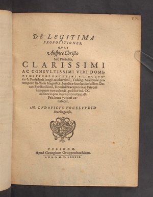 DE LEGITIMA PROPOSITIONES, QVAS ... Sub Prae-sidio, ... DOMINI MATTHAEI ENTZLINI V.I.DOCTOris & Professoris ... Tubing.Academiae pro tempore Rectoris Magnifici, Iuridicae facultatis eiusdem Decani ... publice̢ in I.CC. auditorio ... 28. Feb.hora 7.tueri conabitur. M.LVDOVICVS VOGELVVEID Reutlingensis.