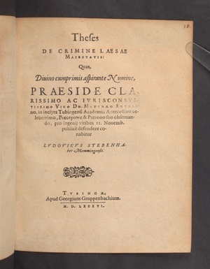 Theses DE CRIMINE LAESAE MAIESTATIS: Quas, Diuino cumprimis aspirante Numine, PRAESIDE ... DN.MATTHAEO ENTZLIno, in inclyta Tubingensi Academia Antecessore celeberrimo, Praeceptore & Patrono suo obseruando, pro ingenij viribus 12.Nouemb. publice̢ defendere coñabitur LVDOVICVS STEBENHAber Memmingensis.