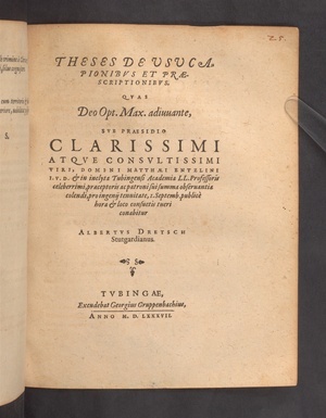 THESES DE USUCAPIONIBVS ET PRAESCRIPTIONIBVS. QVAS ... SVB PRAESIDIO ... DOMINI MATTHAEI ENTZLINI I.V.D. et in inclyta Tubingensi Academia LL.Professoris celeberrimi ... I.Septemb. publice̢ hora et loco consuetis tueri conabitur ALBERTVS DRETSCH Stutcardianus.
