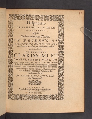 Disputatio DE REMEDIO L.2.C. DE RESCIND: VENDIT: Quam, ... in celeberrima T̃ubingensi Academia, SVB PRAESIDIO ... MATTHAEI ENTZLINI I.V.DOCTORIS, LL.Professoris ordinarij, ac pro tempore Decani ... 16.Septemb. hora 6.matutina, publicè in Aula noua defendere conabitur, M. SEBASTIANVS MITTSCHElius Nürtingensis.
