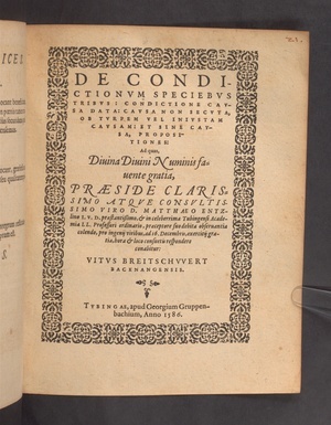 DE CONDICTIONVM SPECIEBVS TRIBVS: CONDICTIONE CAVSA DATA: CAVSA NON SECVTA, OB TVRPEM VEL INIVSTAM CAVSAM: ET SINE CAVSA, PROPOSITIONES: Ad quas, ... PRAESIDE ... D. MATTHAEO ENTZlino I.V.D.praestantißimo, et in celeberrima Tubingensi Academia LL. Professori ordinario ... ad 16. Decembris, exercitij gratia, hora et loco consuetis respondere conabitur: VITVS BREITSCHVVERT BACKNANGENSIS.