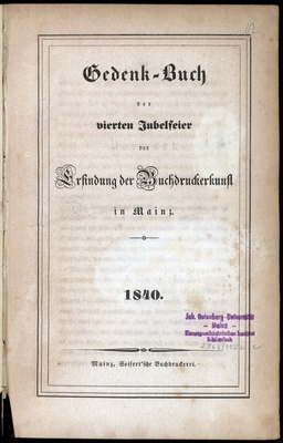 Gedenk-Buch zur vierten Jubelfeier der Erfindung der Buchdruckerkunst in Mainz / [F. Baur ...]