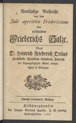 Vorläufige Nachricht von dem "Sale aperitivo Fridericiano" oder eröfnenden Friederichs Salze / Von D. Heinrich Friederich Delius, Hochfürstl. Brandb. Culmbach. Hofrath, der Arzneygelahrheit öffentl. ordentl. Lehrer in Erlangen