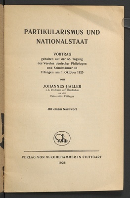 Partikularismus und Nationalstaat : Vortrag gehalten auf der 55. Tagung des Vereins deutscher Philologen und Schulmänner in Erlangen am 1. Okt. 1925 ; mit einem Nachwort