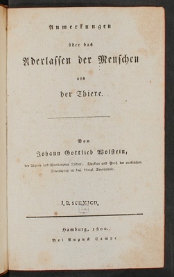 Anmerkungen über das Aderlassen der Menschen und der Thiere / von Johann Gottlieb Wolstein, der Arzney und Wundarzney Doktor, Direktor und Prof. der praktischen Thierarzney im kais. königl. Thierspitale.