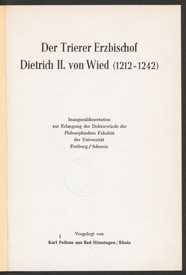 Der Trierer Erzbischof Dietrich II. von Wied (1212 - 1242) / vorgelegt von Karl Pellens