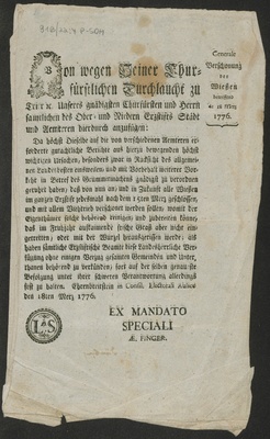 Von wegen Seiner Churfürstlichen Durchlaucht zu Trier[et]c. Unseres gnädigsten Churfürsten und Herrn samtlichen des Ober- und Nierdern Erzstifts Städt und Aemteren hierdurch anzufügen: Da höchst Dieselbe auf die von verschiedenen Aemteren erforderte gutachtliche Berichte aus hierzu bewegenden höchst wichtigen Ursachen ... in Betref des Grümmermachens gnädigst zu verordnen geruhet haben, daß von nun an, und in Zukunft alle Wießen im ganzen Erzstift jedesmahl nach dem 15ten Merz geschlossen, und mit allem Viehtrieb verschonet werden sollen ... Ehrenbreitstein in Consil. Electorali Aulico den 18ten Merz 1776. / [Klemens Wenzeslaus, Kurfürst von Trier]. Ex Mandato Speciali