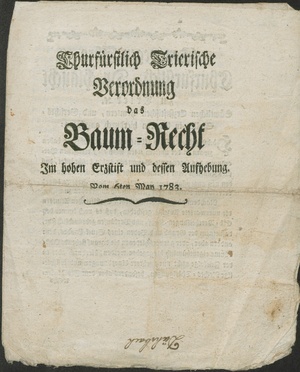 Churfürstlich Trierische Verordnung das Baum-Recht im hohen Erzstift und dessen Aufhebung : vom 6ten May 1783 / [Clemens Wenceslaus Churfürst]. Ex Mandato Serenissimi Elect. Spli. J. L. Schaeffer