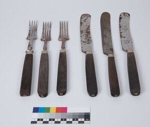 Französisches Tranchiermesser und Gabelset mit Horngriffen