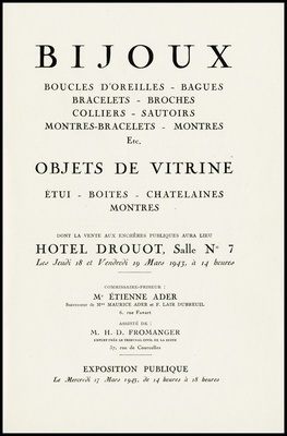 Bijoux : boucles d'oreilles, bagues, bracelets, broches, colliers, autoirs, montres- bracelets, montres etc. : objets de vitrine : étui, boîtes, chatelaines, montres : dont la vente aux enchères publiques aura lieu Hôtel Drouot, Salle No 7, les jeudi 18 et vendredi 19 mars 1943 / commissaire-priseur: Étienne Ader, assisté de: H.-D. Fromanger