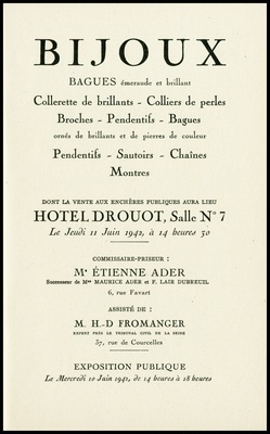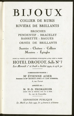 Bijoux : collier de rubis, rivière de brillants, broches, pendentif, bracelet, barrette, bagues, ornés de brillants, sautoirs, chaînes, colliers, montres, épingles : dont la vente aux enchères publiques aura lieu à Paris, Hôtel Drouot, Salle No 7, les mecredi 1er juillet et jeudi 2 juillet 1942 / commissaire-priseur: Étienne Ader, assisté de: H.-D. Fromanger