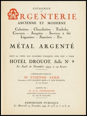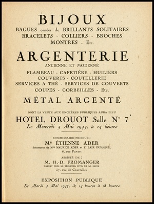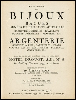 Catalogue des bijoux : bagues ornées de brillants solitaires, barrettes, broches, bracelets, boucles d'oreilles, montres, etc. : argenterie, services à thé, cafetières, plats, coupes, jattes, jardinières, plateaux, couverts etc. : dont la vente aux enchères publiques aura lieu Hôtel Drouot, Salle No 9, le jeudi 25 novembre 1943 / commissaire-priseur: Étienne Ader, assisté de: H.-D. Fromanger