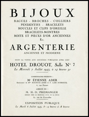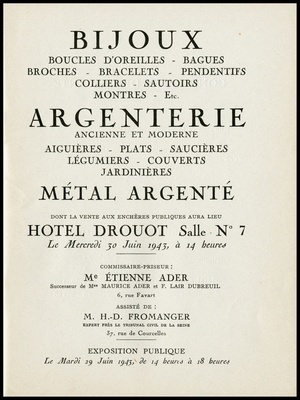 Bijoux : boucles d'oreilles, bagues, broches, bracelets, pendentifs, colliers, sautoirs, montres, etc. : argenterie ancienne et moderne : aiguières, plats, saucières, légumiers, couverts jardinières : métal argenté : dont la vente aux enchères publiques aura lieu Hôtel Drouot, Salle No 7, le mercredi 30 juin 1943 / commissaire-priseur: Étienne Ader, assisté de: H.-D. Fromanger