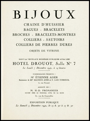 Bijoux : chaîne d'huissier, bagues, bracelets, broches, bracelets-montres, colliers, sautoirs, colliers de pierres dures, objets de vitrine : dont la vente aux enchères publiques aura lieu Hôtel Drouot, le lundi 7 décembre 1942, Salle No 7 / commissaire-priseur: Étienne Ader, assisté de: H.-D. Fromanger