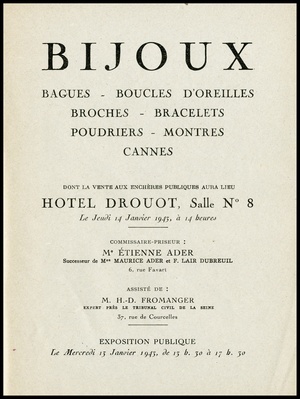 Bijoux : bagues, boucles, d'oreilles, broches, bracelets, poudriers, montres, cannes : dont la vente aux enchères publiques aura lieu Hôtel Drouot, Salle No 8, le jeudi 14 janvier 1943 / commissaire-priseur: Étienne Ader, assisté de: H.-D. Fromanger