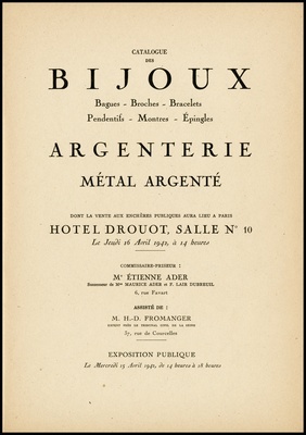 Catalogue des bijoux : bagues, broches, bracelets, pendentifs, montres, épingles : argenterie : métal argenté : dont la vente aux enchères publiques aura lieu à Paris, Hôtel Drouot, Salle No 10, le jeudi 16 avril 1942 / commissaire-priseur: Étienne Ader, assisté de: H.-D. Fromanger